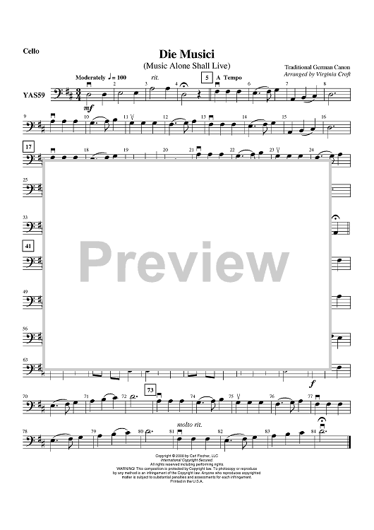 Digital Sheet Music for Die Musici (Music Alone Shall Live) - Cello by Traditional German Canon, Virginia Croft scored for Orchestra; id:406905