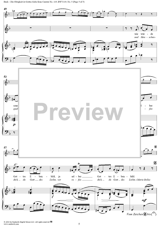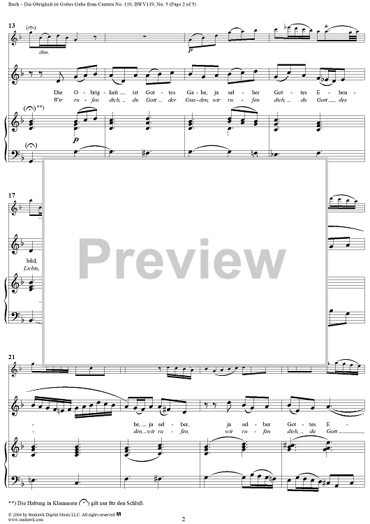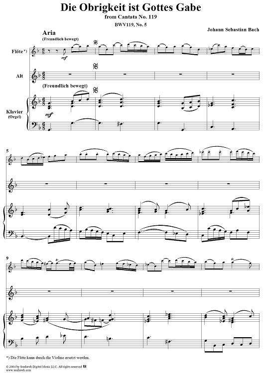 Digital Sheet Music for "Die Obrigkeit ist Gottes Gabe", Aria, No. 5 from Cantata No. 119: "Preise, Jerusalem, den Herrn" - Piano Score by Johann Sebastian Bach scored for Alto, Flute or Violin and Piano or Organ; id:303794