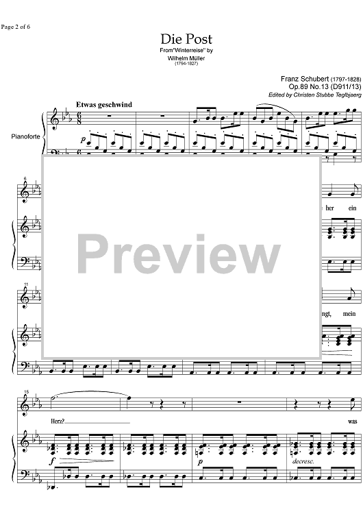 Digital Sheet Music for Die Post Op.89 No.13 D911 by , Franz Schubert scored for Tenor/Piano; id:331937