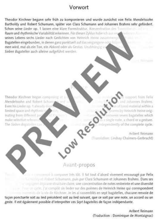 Theodor Kirchner (1823-1903) began composing at a very early age, initially receiving great support from Felix Mendelssohn and Robert Schumann and subsequently from Clara Schumann and Johannes Brahms. Even his Lieder op. 1 already display a clear formal structure, the concentration of tonal material within a limited space and rhythmic variability. I have selected six lieder based on poems by Heinrich Heine originating from different periods of Kirchner’s life and interleaved them between seven bagatelles which make selective references to the previous or next lied, sometimes as a single note, a chord or a gesture. The Sieben Bagatellen can additionally be performed separately, independently of the complete cycle. (Aribert Reimann)