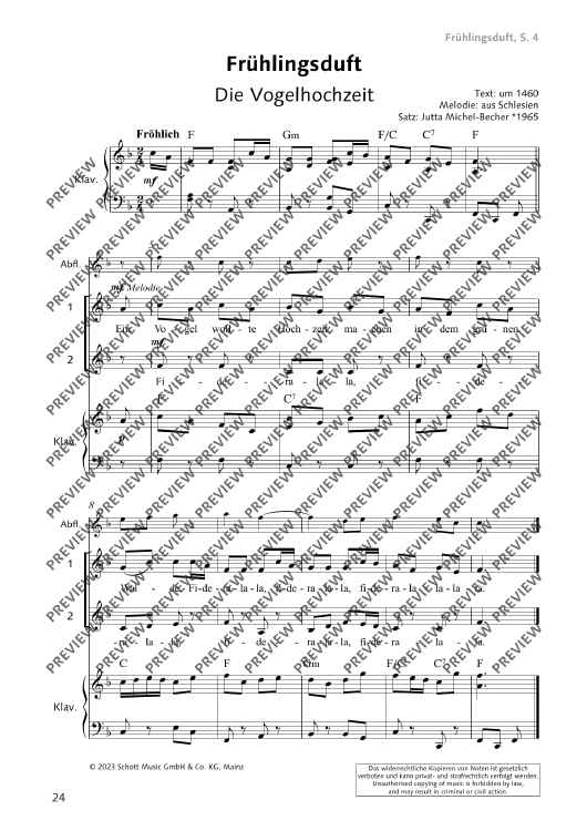 Digital Sheet Music for Die Vogelhochzeit by Jutta Michel-Becher, Traditionell scored for For Two Part Choir And Piano, Alto Recorder Ad Lib.; id:499997