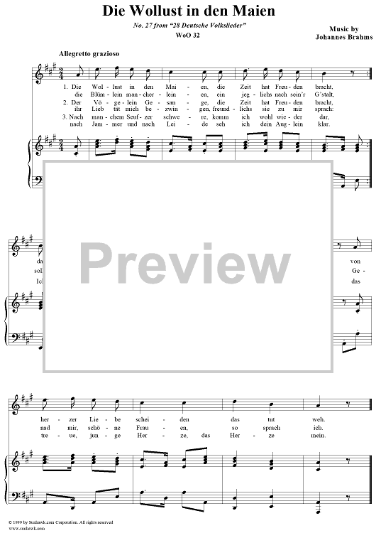 Digital Sheet Music for Die Wollust in den Maien - No. 27 from "28 Deutsche Volkslieder" WoO 32 by Johannes Brahms scored for Voice/Piano; id:274169