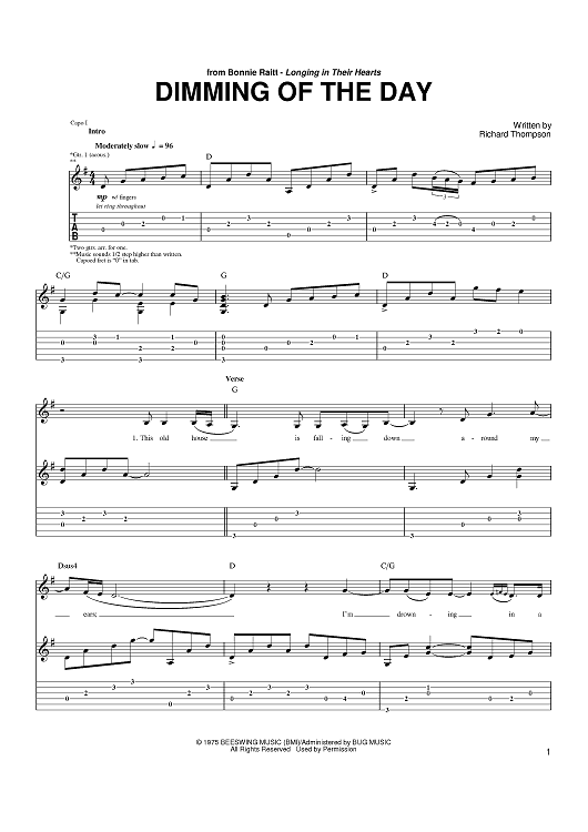 Digital Sheet Music for Dimming Of The Day by Bonnie Raitt, Emmylou Harris, Richard Thompson scored for Guitar Tab; id:373571