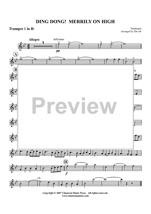 Digital Sheet Music for Ding Dong! Merrily on High - Trumpet 1 in B-flat by , Tim Olt, Traditional scored for Brass Quintet; id:365673