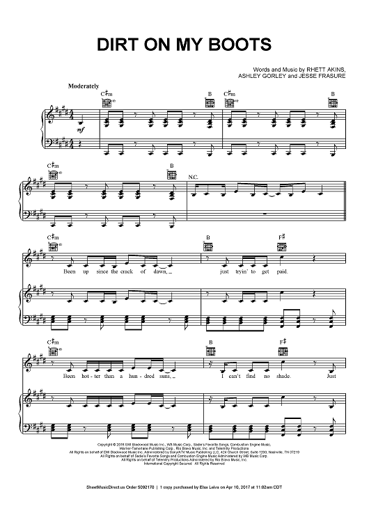Digital Sheet Music for Dirt On My Boots by Rhett Akins, Ashley Gorley, Jon Pardi, Jesse Frasure scored for Piano/Vocal/Chords; id:464234
