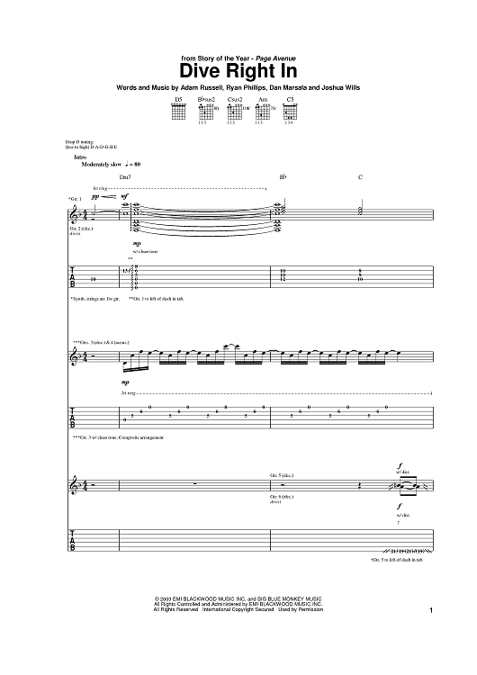 Digital Sheet Music for Dive Right In by Dan Marsala, Ryan Phillips, Adam Russell, Story Of The Year scored for Guitar Tab; id:374621
