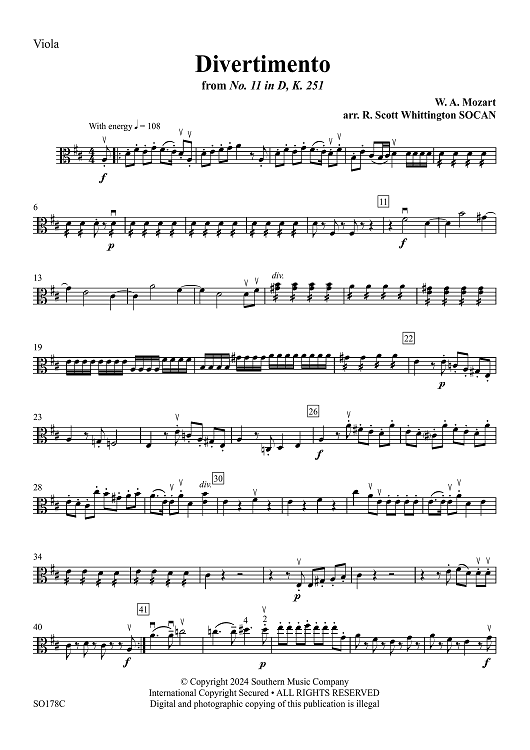 Digital Sheet Music for Divertimento from No. 11 in D, K. 251 - Viola by Wolfgang Amadeus Mozart, R. Scott Whittington scored for String Orchestra; id:506241