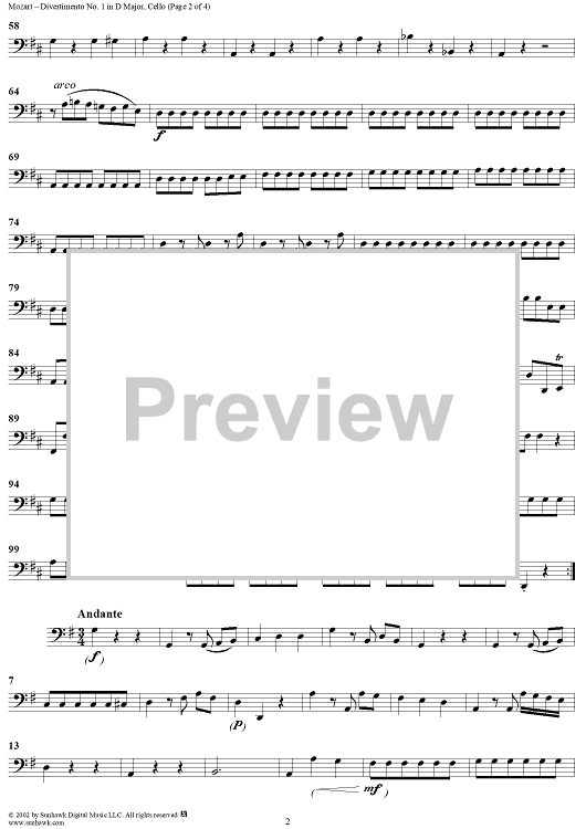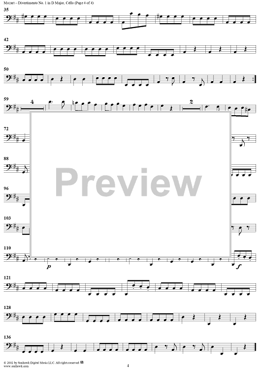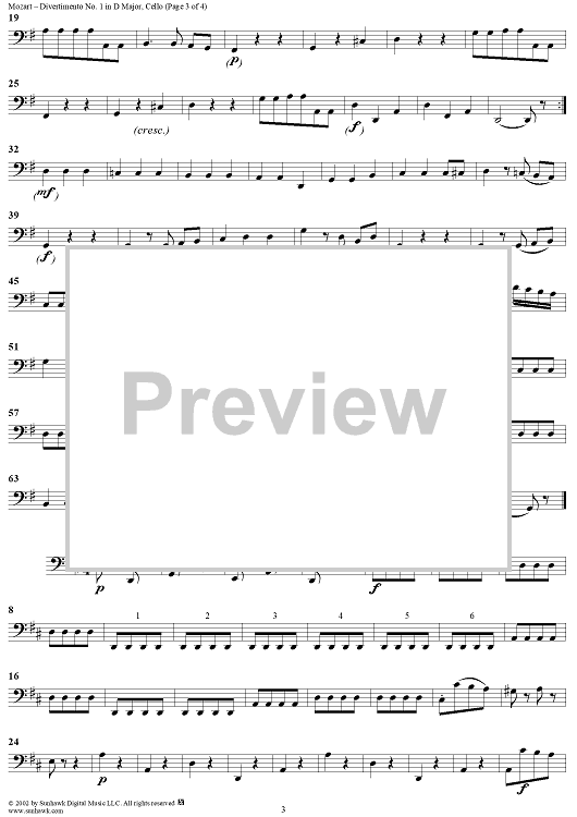 Digital Sheet Music for Divertimento No. 1 in D Major, K136 - Cello by Wolfgang Amadeus Mozart scored for String Quartet; id:253050
