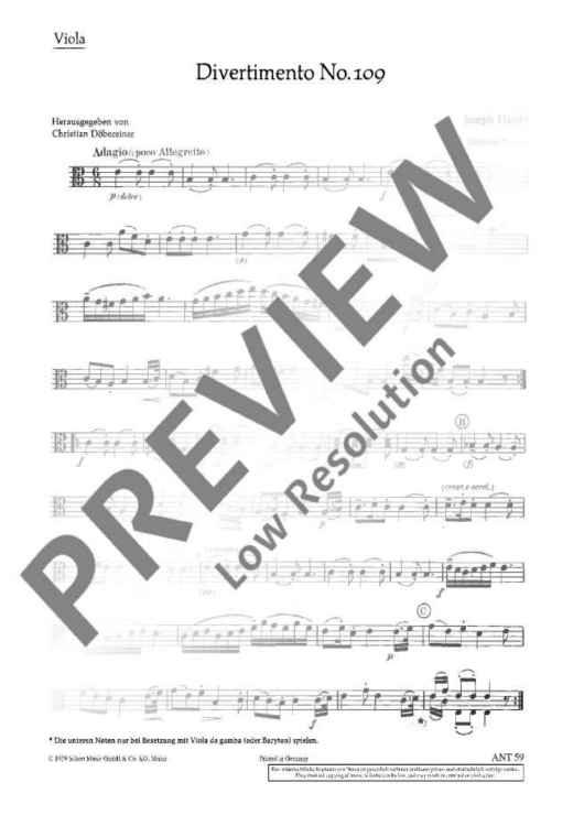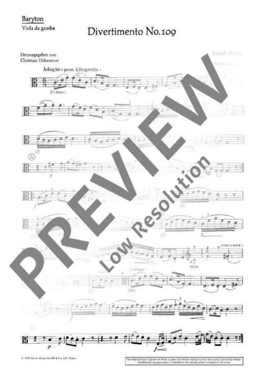 Digital Sheet Music for Divertimento No. 109 in C major - Set of Parts by Joseph Haydn scored for Baryton (violin, Viola Da Gamba), Viola And Cello; id:471044