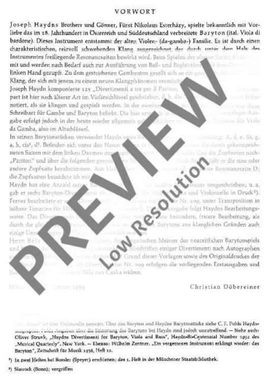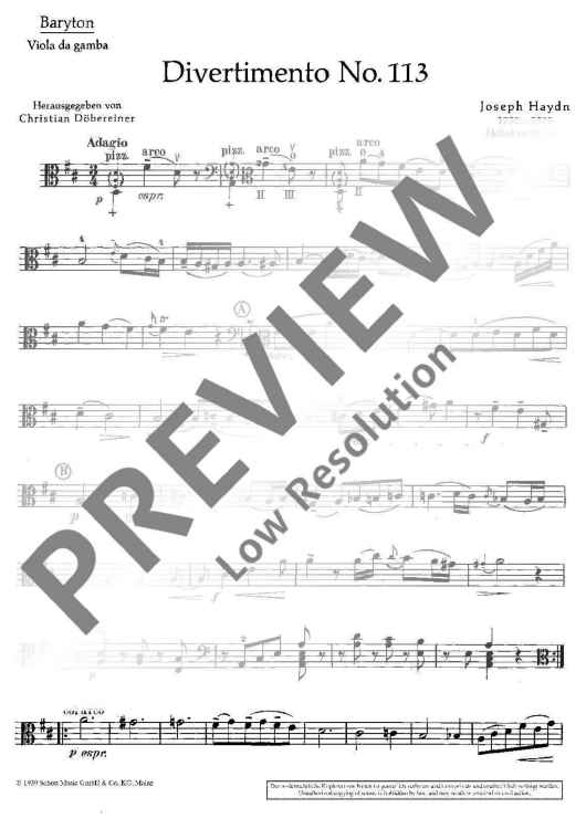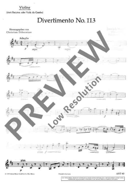 Digital Sheet Music for Divertimento No. 113 in D major - Set of Parts by Joseph Haydn scored for Baryton (violin, Viola Da Gamba), Viola And Cello; id:471045