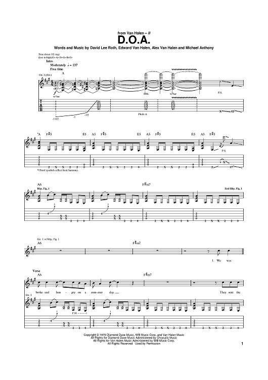 Digital Sheet Music for D.O.A. by Eddie Van Halen, David Lee Roth, Michael Anthony, Alex Van Halen, Van Halen scored for Guitar Tab; id:385942