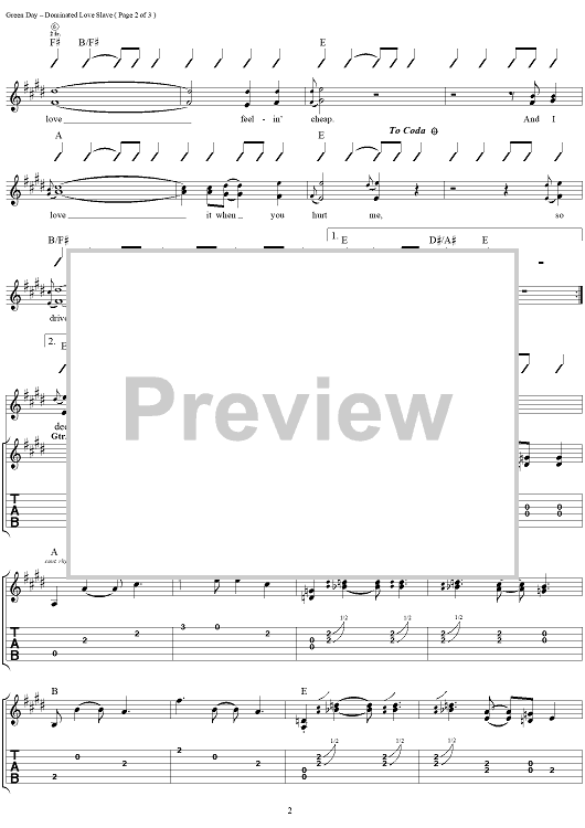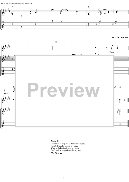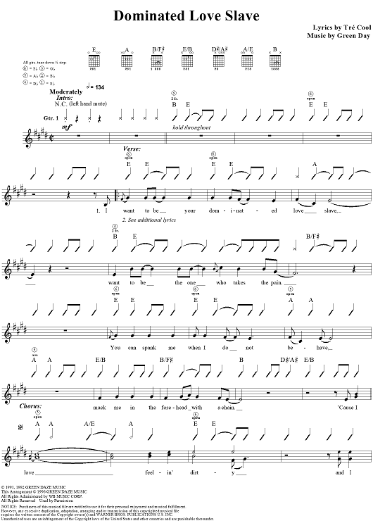 Digital Sheet Music for Dominated Love Slave by Tré Cool, Green Day scored for Guitar Tab/Vocal; id:113023