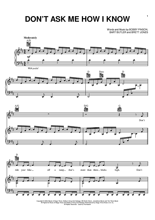 Digital Sheet Music for Don't Ask Me How I Know by Brett Jones, Bart Butler, Bobby Pinson scored for Piano/Vocal/Chords; id:384619