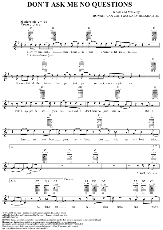 "Don't Ask Me No Questions" Sheet Music by Lynyrd Skynyrd