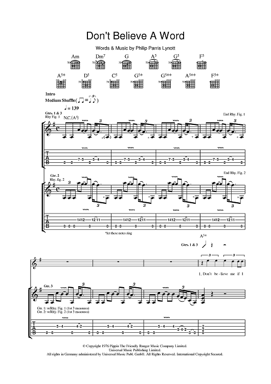 Digital Sheet Music for Don't Believe A Word by Thin Lizzy, Phil Lynott scored for Guitar Tab; id:398720