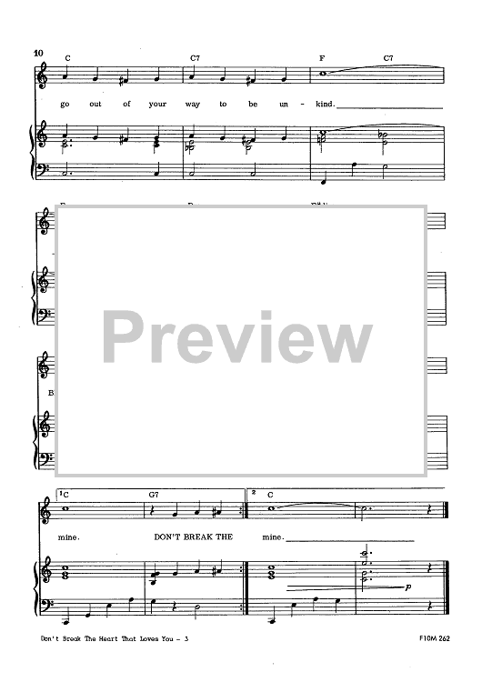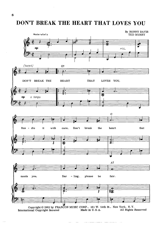 Digital Sheet Music for Don't Break The Heart That Loves You by Connie Francis, Mark Barkan, Hank Hunter scored for Piano/Vocal/Chords; id:423070