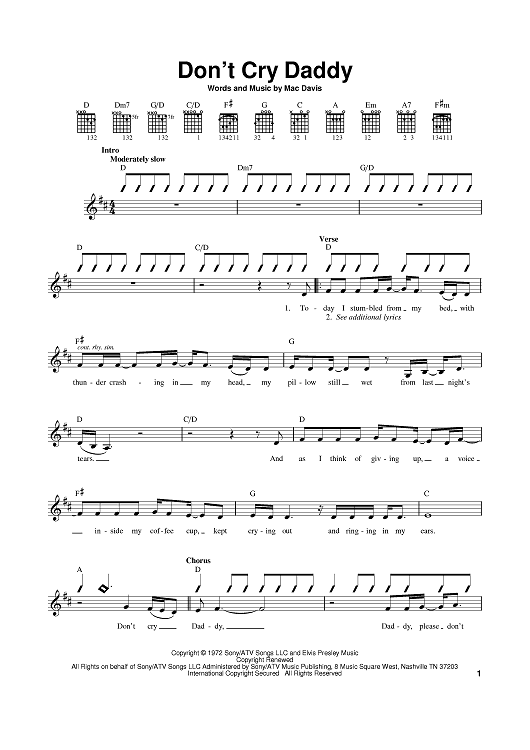 "Don't Cry Daddy" Sheet Music by Elvis Presley