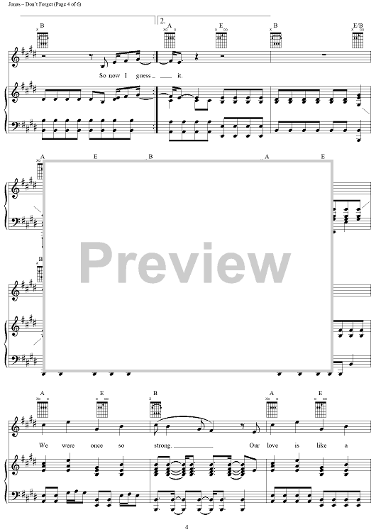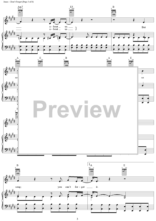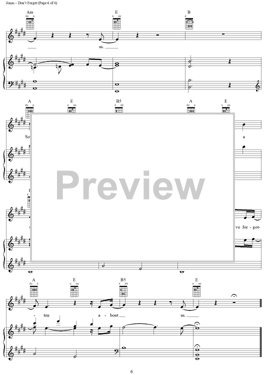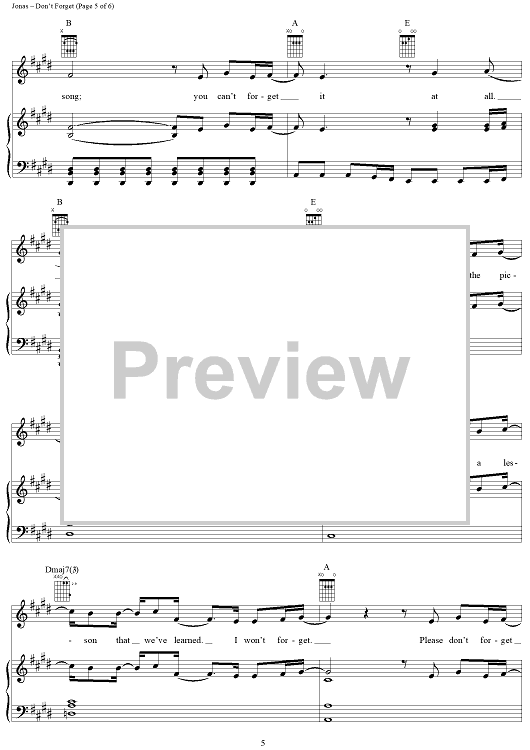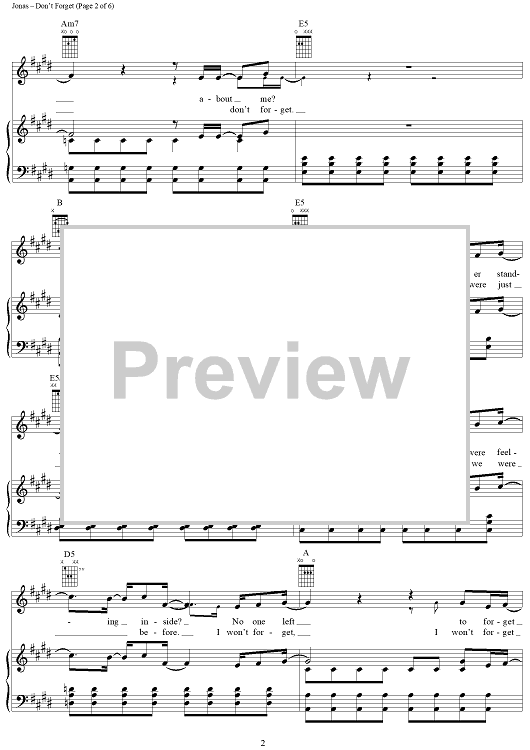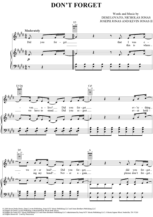 Digital Sheet Music for Don't Forget by Nicholas Jonas, Joseph Jonas, Kevin Jonas II, Demi Lovato scored for Piano/Vocal/Chords; id:404839