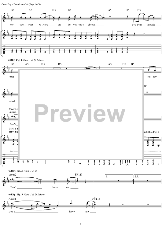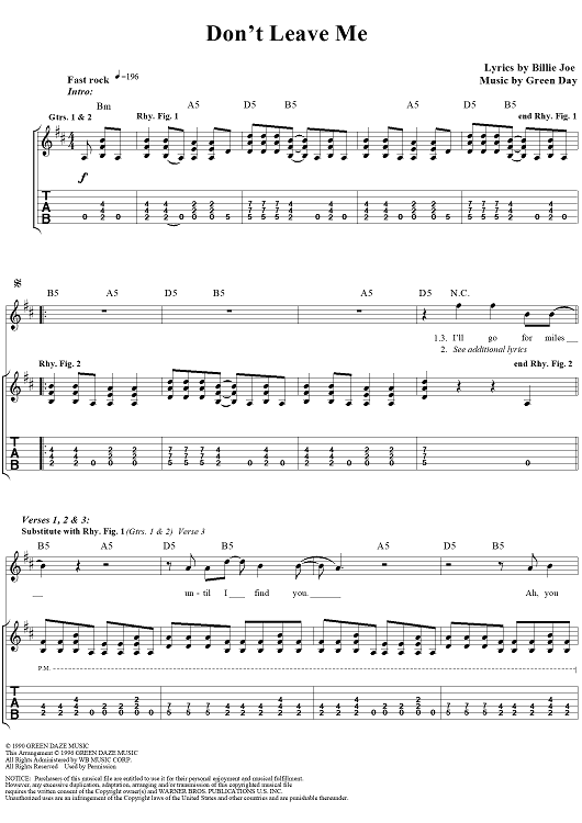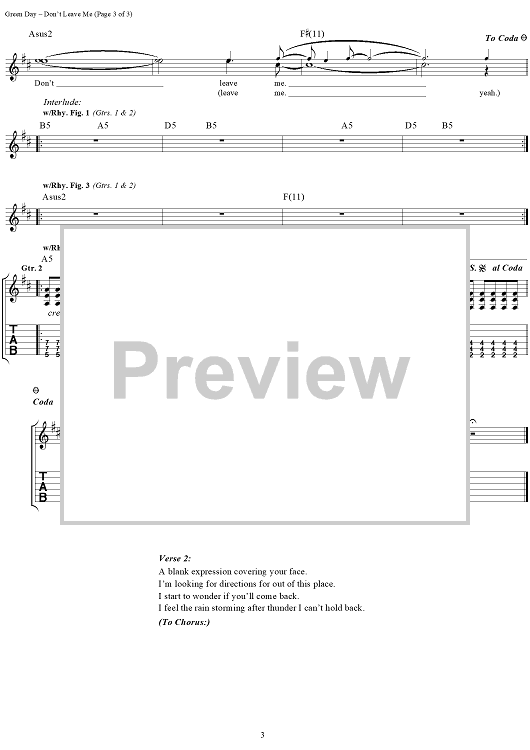 Digital Sheet Music for Don't Leave Me by Billie Joe Armstrong, Green Day scored for Guitar Tab/Vocal; id:112966