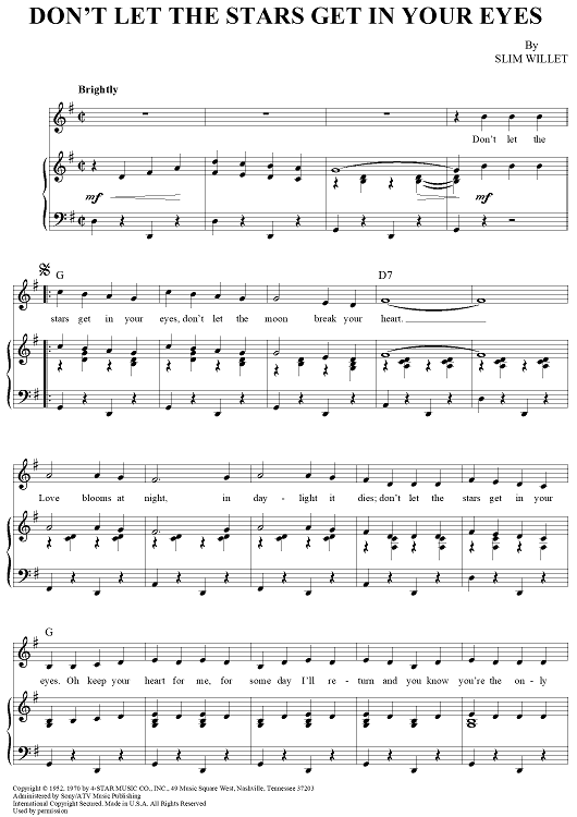 Digital Sheet Music for Don't Let the Stars Get in Your Eyes by Perry Como, Slim Willet scored for Piano/Vocal/Chords; id:362755
