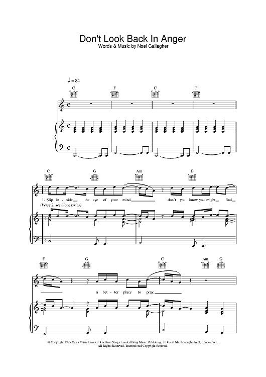 Digital Sheet Music for Don't Look Back In Anger by Oasis scored for Piano/Vocal/Chords; id:379026