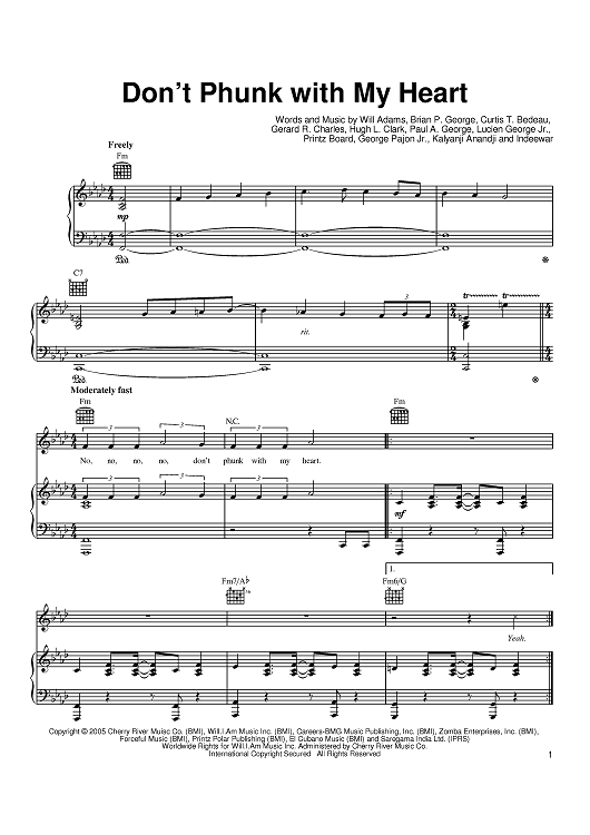 Digital Sheet Music for Don't Phunk With My Heart by Printz Board, will.i.am, Kalyanji Anadji, Curtis T. Bedeau, Black Eyed Peas, Gerard Charles, Hugh L. Clark, Lucien George Jr., Brian George, Paul George, Indeewar, George Pajon Jr. scored for Piano/Vocal/Chords; id:385802