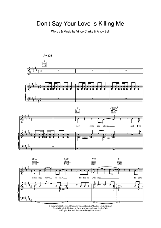 Digital Sheet Music for Don't Say Your Love Is Killing Me by Andy Bell, Vince Clarke, Erasure scored for Piano/Vocal/Chords; id:379791