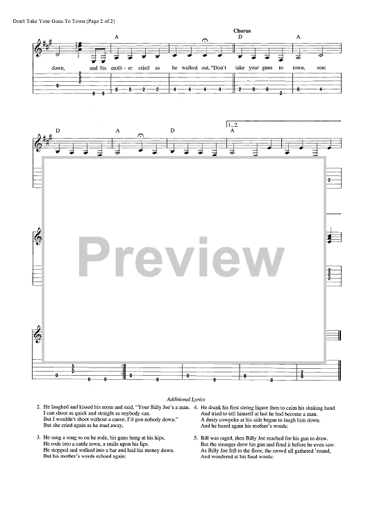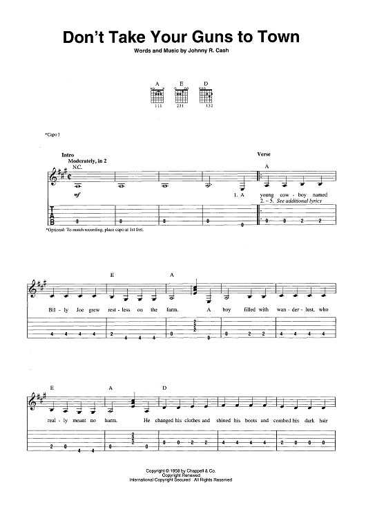 Digital Sheet Music for Don't Take Your Guns to Town by Johnny Cash scored for Easy Guitar Tab/Vocal/Chords; id:456770