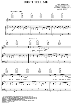 Digital Sheet Music for Don't Tell Me by Madonna, Joe Henry, Mirwais Ahmadzaï scored for Easy Guitar Tab/Vocal; id:469015