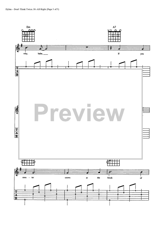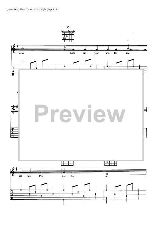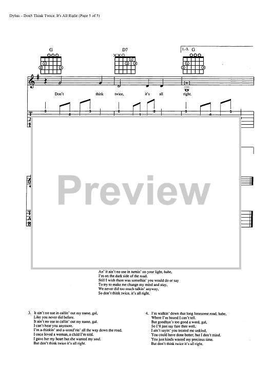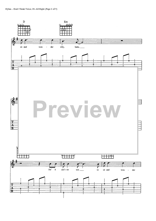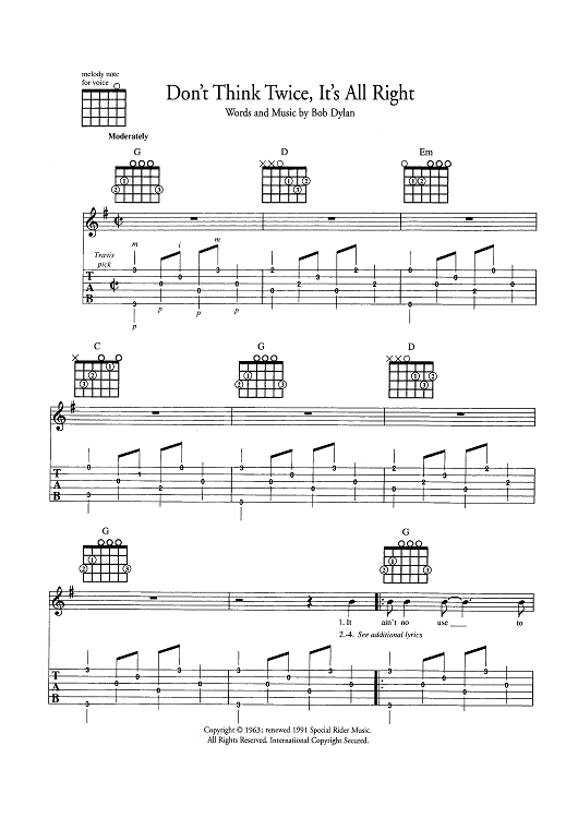 Digital Sheet Music for Don't Think Twice, It's All Right by Bob Dylan scored for Guitar Tab/Vocal/Chords; id:445428