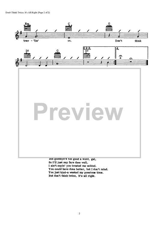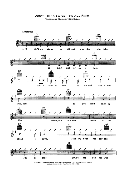 "Don't Think Twice, It's All Right" Sheet Music by Bob Dylan