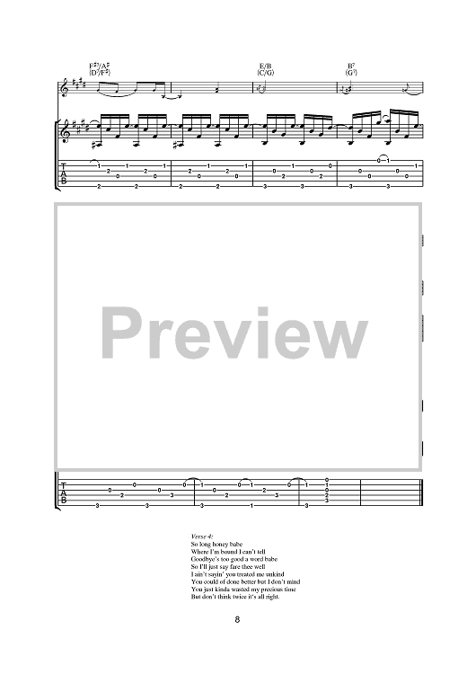 Digital Sheet Music for Don't Think Twice, It's Alright by Bob Dylan scored for Guitar Tab; id:380766