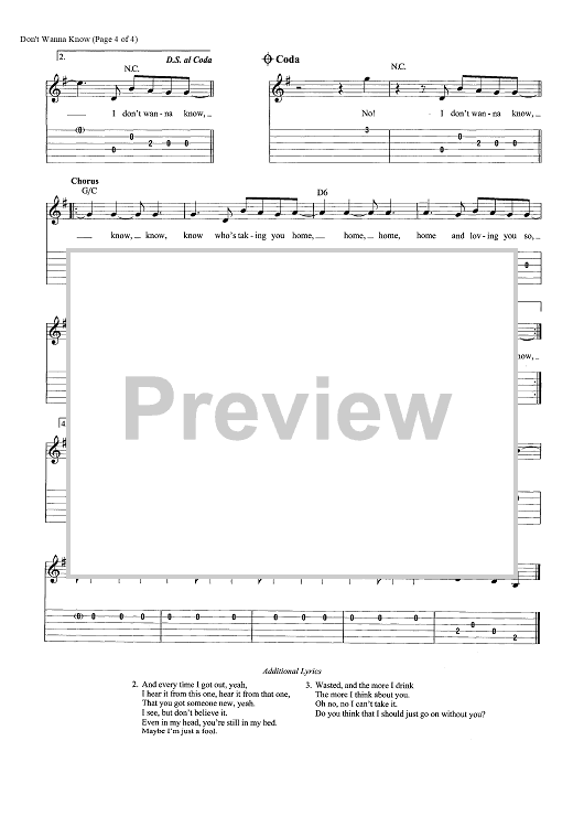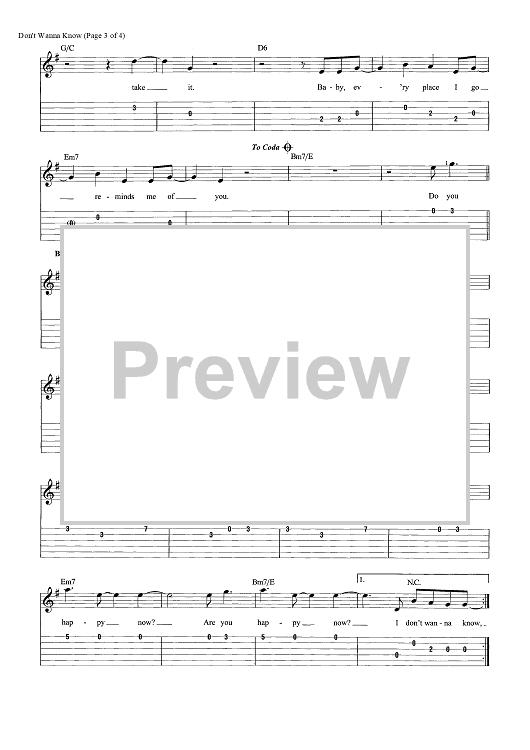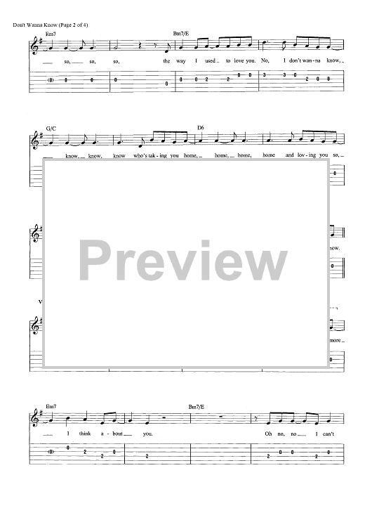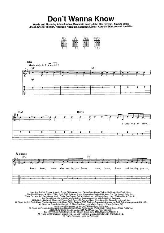 Digital Sheet Music for Don't Wanna Know by Adam Levine, Maroon 5, Benjamin Levin, Jacob Hindlin, Ammar Malik, Kurtis McKenzie, John Henry Ryan, Alexander Ben-Abdullah, Jon Mills scored for Easy Guitar Tab/Vocal; id:465620