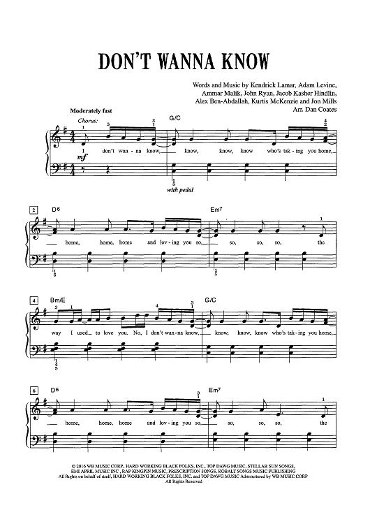 Digital Sheet Music for Don't Wanna Know by Dan Coates, Adam Levine, Maroon 5, Jacob Hindlin, Ammar Malik, Kurtis McKenzie, Kendrick Lamar, John Henry Ryan, Alexander Ben-Abdullah, Jon Mills scored for Easy Piano/Vocal/Chords; id:466691
