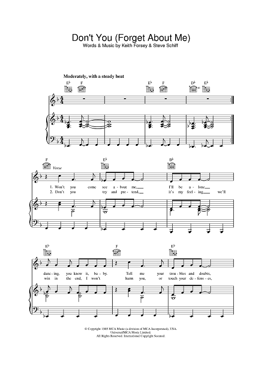 Digital Sheet Music for Don't You (Forget About Me) by Simple Minds, Keith Forsey, Steve Schiff scored for Piano/Vocal/Chords; id:387039