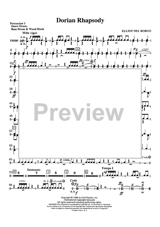 Digital Sheet Music for Dorian Rhapsody - Percussion 1 by Elliot Del Borgo scored for Concert Band; id:435273