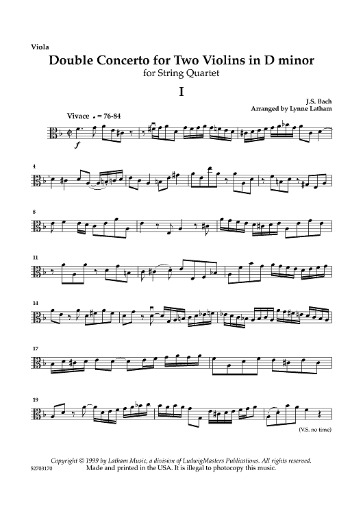 Digital Sheet Music for Double Concerto for Two Violins - Viola by Johann Sebastian Bach, Lynne Latham scored for String Quartet; id:462830