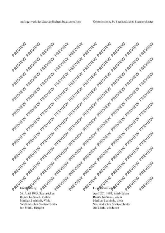 In this double concerto the Violin and Viola represent both aspects of a Janus-faced being: monolithic chordal blocks (in the second movement culminating in C major!) versus delicate melodic lines spreading and branching out, the contrast between solidity and weightlessness. A poem by Paul Celan inspired the composer to use this imagery of opposites.