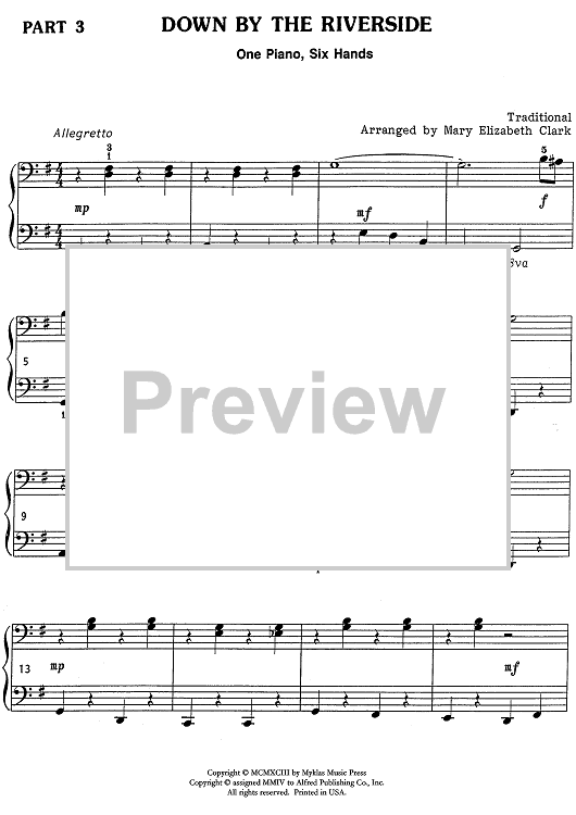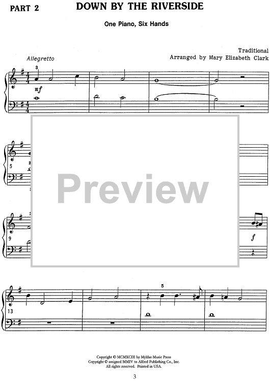 The traditional spiritual is arranged for one piano, six hands intermediate piano trio by Mary Elizabeth Clark. This lively version is in the key of G major. Separate score sheets are included for each performer along with a conductor's score on the inside cover.