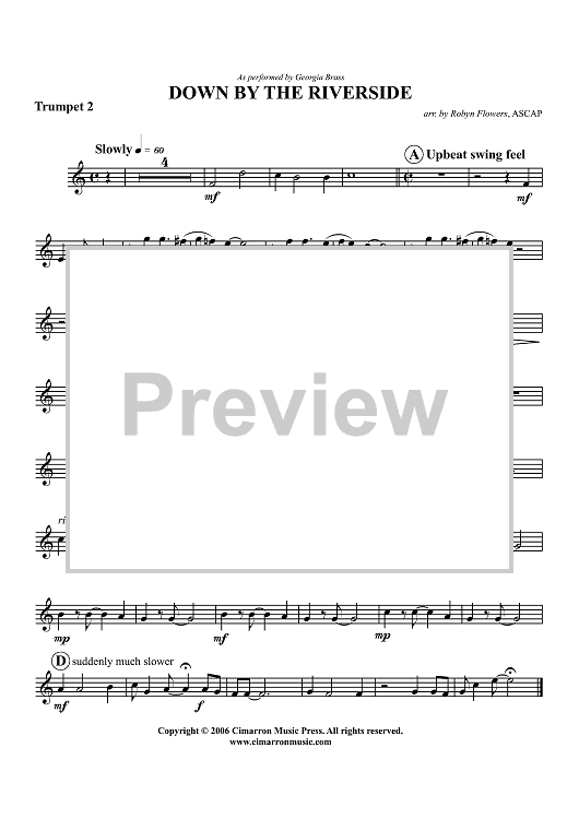 Digital Sheet Music for Down By the Riverside - Trumpet 2 by Robyn Flowers, Georgia Brass scored for Brass Quartet; id:356506