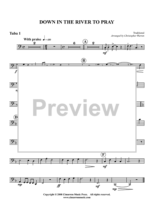 Digital Sheet Music for Down in the River to Pray - Tuba 1 by Traditional, Christopher Warren scored for Tuba Quartet; id:426422