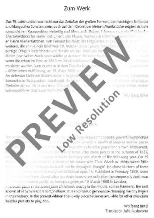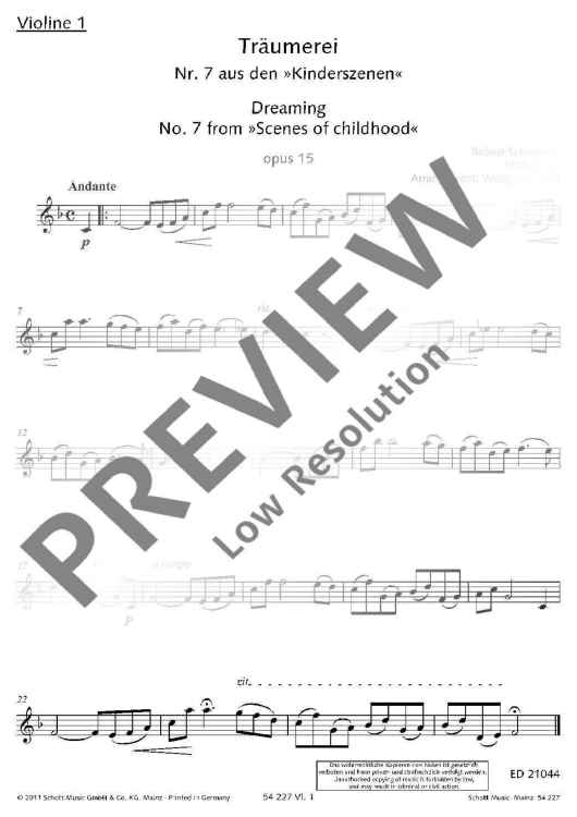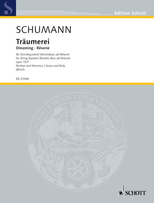 The 19th century was not only the era of great forms, monumental symphonies and melodious sonatas, no, the Romantic composers proved to be versatile and highly imaginative on the field of little music pieces as well. Robert Schumann was a master of the character piece for "his" instrument, the piano. From thirty of such poetic miniatures, he selected thirteen in 1838 for his 'Scenes of Childhood', opus 15, the seventh, i.e. the one right in the middle, being 'Dreaming', the most famous among Schumann's compositions. It is a romantic gem the catchy melody of which will not get out of one's head. The beautiful setting contained in the present edition can be played also in a version for string quartet with additional double-bass part for ensemble playing.