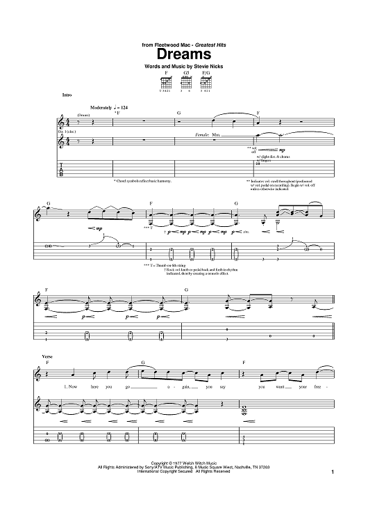 Digital Sheet Music for Dreams by Stevie Nicks, Fleetwood Mac scored for Guitar Tab; id:368944