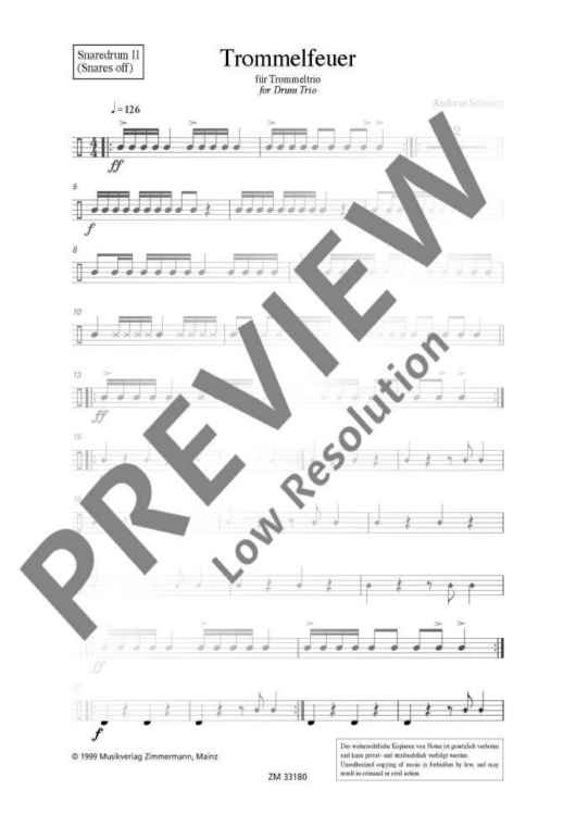 This composition originated in the idea of having advanced students and comparative beginners perform in the same piece at a concert without demanding too much or too little of either side. It was the tension between technical problems of how to play together on one hand and exuberant rhythmics on the other hand that turned "Trommelfeuer (Drum Fire)" into a strong and vehement experience in which players of all ages and levels of development were united.