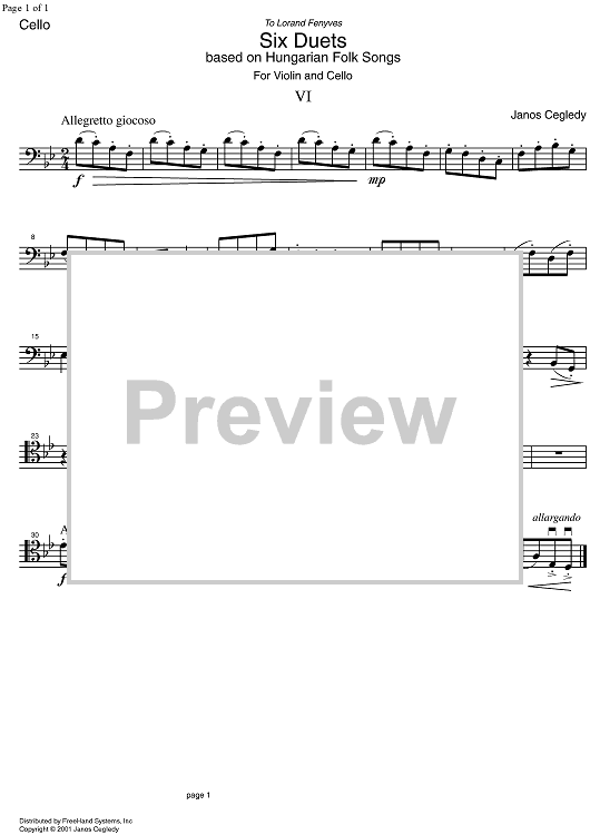 "Duet No. 6 from 6 duets based on Hungarian Folk Songs - Cello" Sheet Music by Janos Cegledy