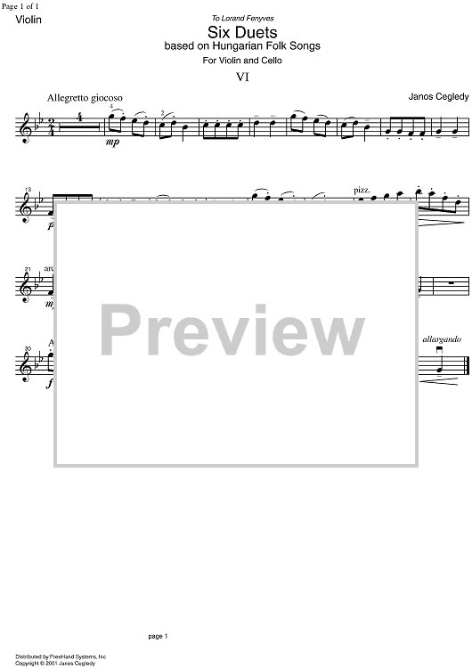 Digital Sheet Music for Duet No. 6 from 6 duets based on Hungarian Folk Songs - Violin by , Janos Cegledy scored for Violin/Cello; id:332193
