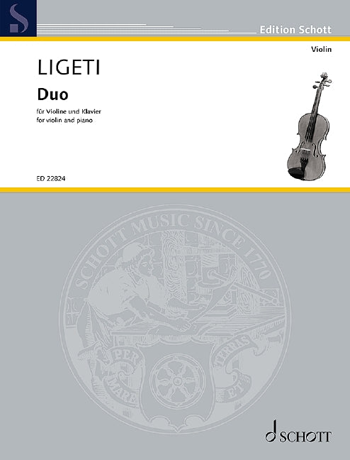 György Ligetis Duo für Violine und Klavier, das mit dieser Ausgabe erstmals publiziert wird, entstand im Dezember 1946, während seines Studiums an der Franz Liszt-Musikakademie in Budapet. Ligeti betrieb zu jener Zeit intensive Kontrapunktstudien. Darüber hinaus ist das Werk der auf Bartók und Kodály zurückgehenden Idee einer kunstvoll stilisierten Volksmusik verpflichtet.