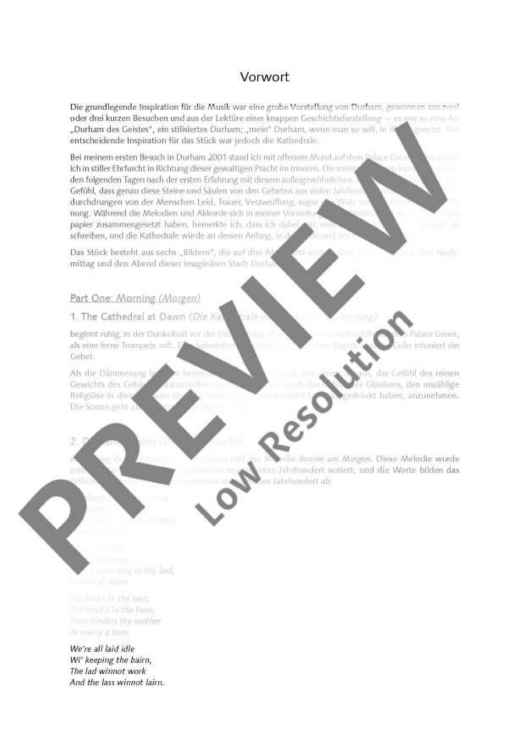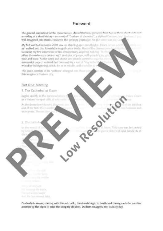 The general inspiration for the music was an idea of Durham, garnered from two or three short visits and a reading of a short history – so a sort of “Durham of the mind”, a stylized Durham; ‘my’ Durham, if you will, imagined into music. However, the defining inspiration for the piece was the Cathedral. My first visit to Durham in 2001 saw me standing open-mouthed on Palace Green, and then in silent awe as I walked into that formidable magnificence inside. Most of the themes came from the days immediately following my first experience of this extraordinary, inspiring building. The feeling that the very stones and pillars themselves are imbued with centuries of prayer, with people’s joy, grief, despair, even anger; gratitude and hope. As the tunes and chords and sounds started to organize themselves in my mind and onto manuscript paper, I realized that I was writing a sort of “day in the life of Durham”, and that the Cathedral would be its beginning, would be in its middle, and would be at its ending. The piece consists of six ‘pictures’ arranged into three parts – the morning, afternoon and evening of this imaginary Durham city. Jon Lord, 2017