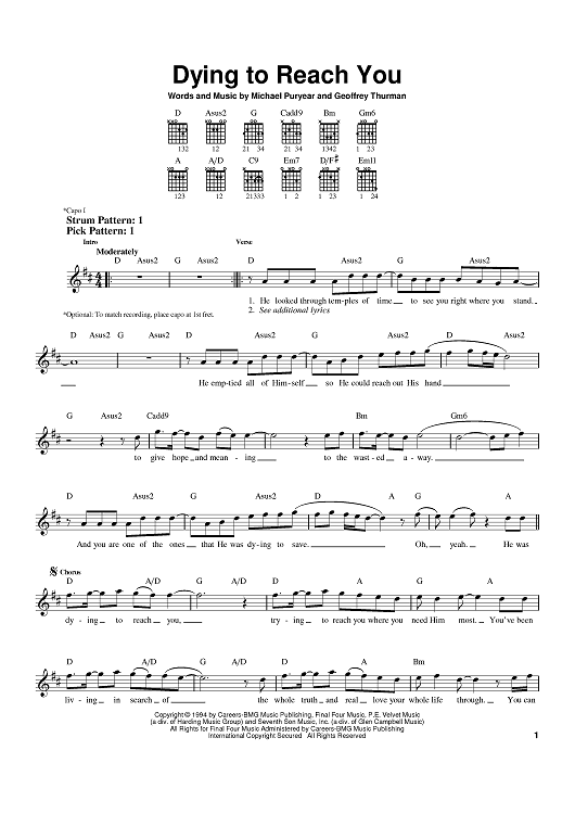 Digital Sheet Music for Dying To Reach You by Point of Grace, Michael Puryear, Geoff Thurman scored for Easy Guitar; id:398210