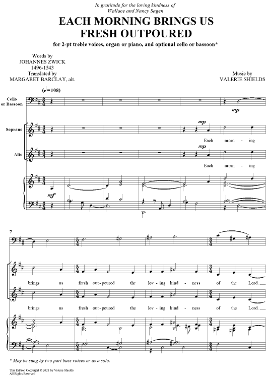 Digital Sheet Music for Each Morning Brings Us Fresh Outpoured by Valerie Shields, Johannes Zwick scored for SA / Piano, (opt. cello or bassoon); id:469082